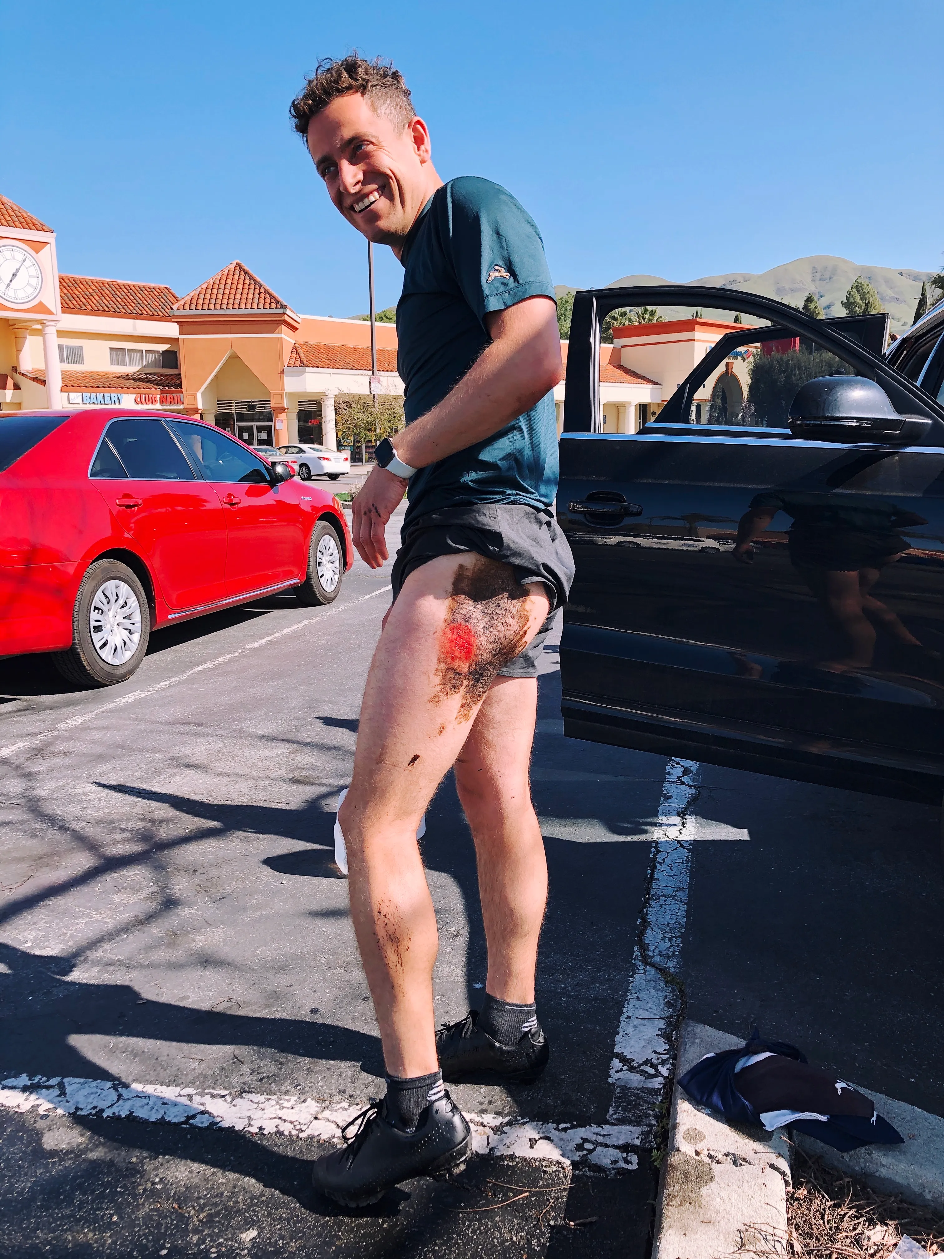 With some serious road burn, I was in rough shape, but the show needed to go on! Some quick Googling on how to remove tar and grease from skin led us to the nearest CVS where Avi helped lube me up with baby oil in the parking lot.