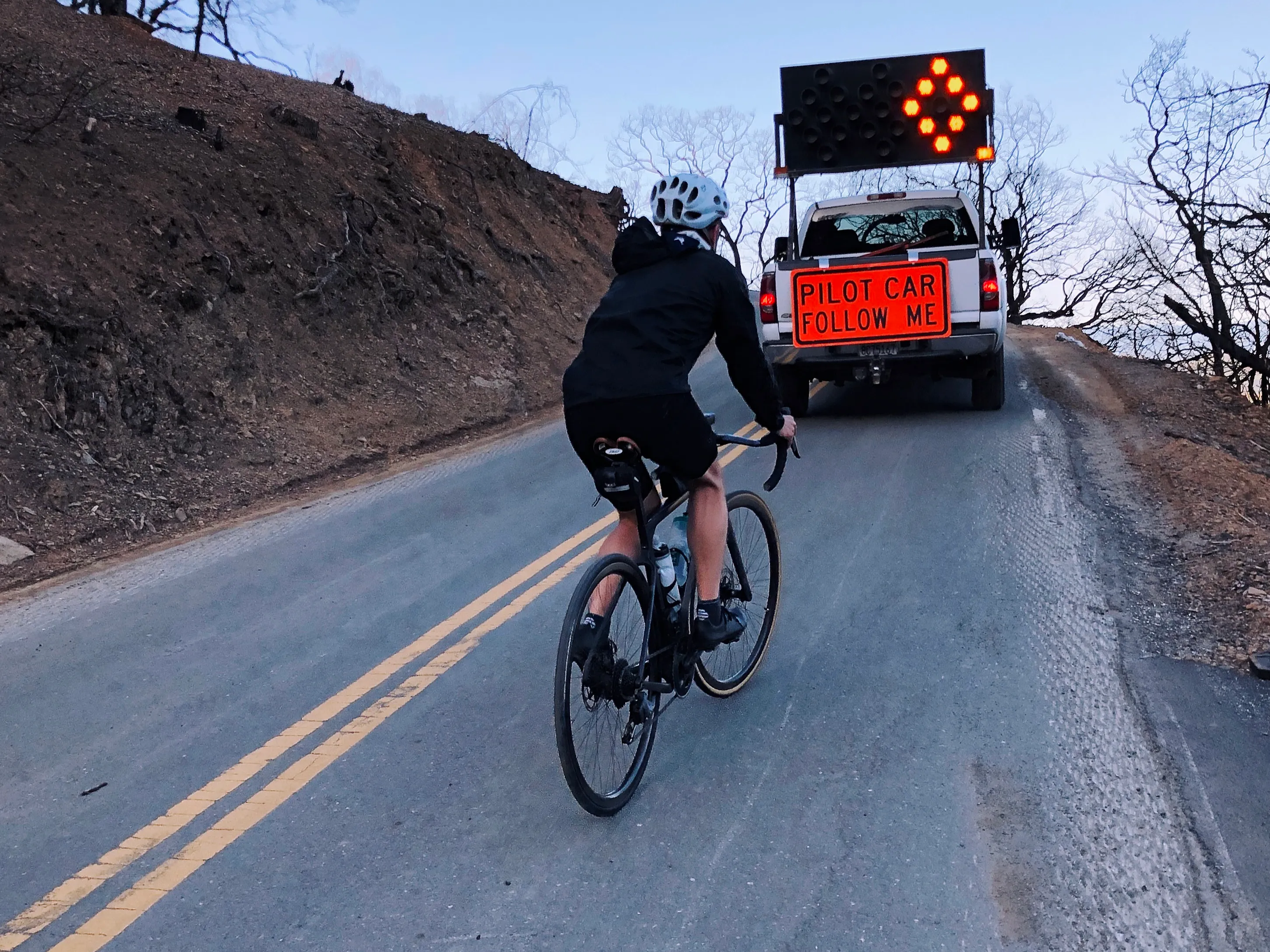 On the way down, we slowly rolled past a road worker who failed to notify us that the next bit of road was in the middle of being re-paved and had been coated with what can only be called grease. I hit my brakes and promptly fishtailed, then crashed and slid across the slippery surface.