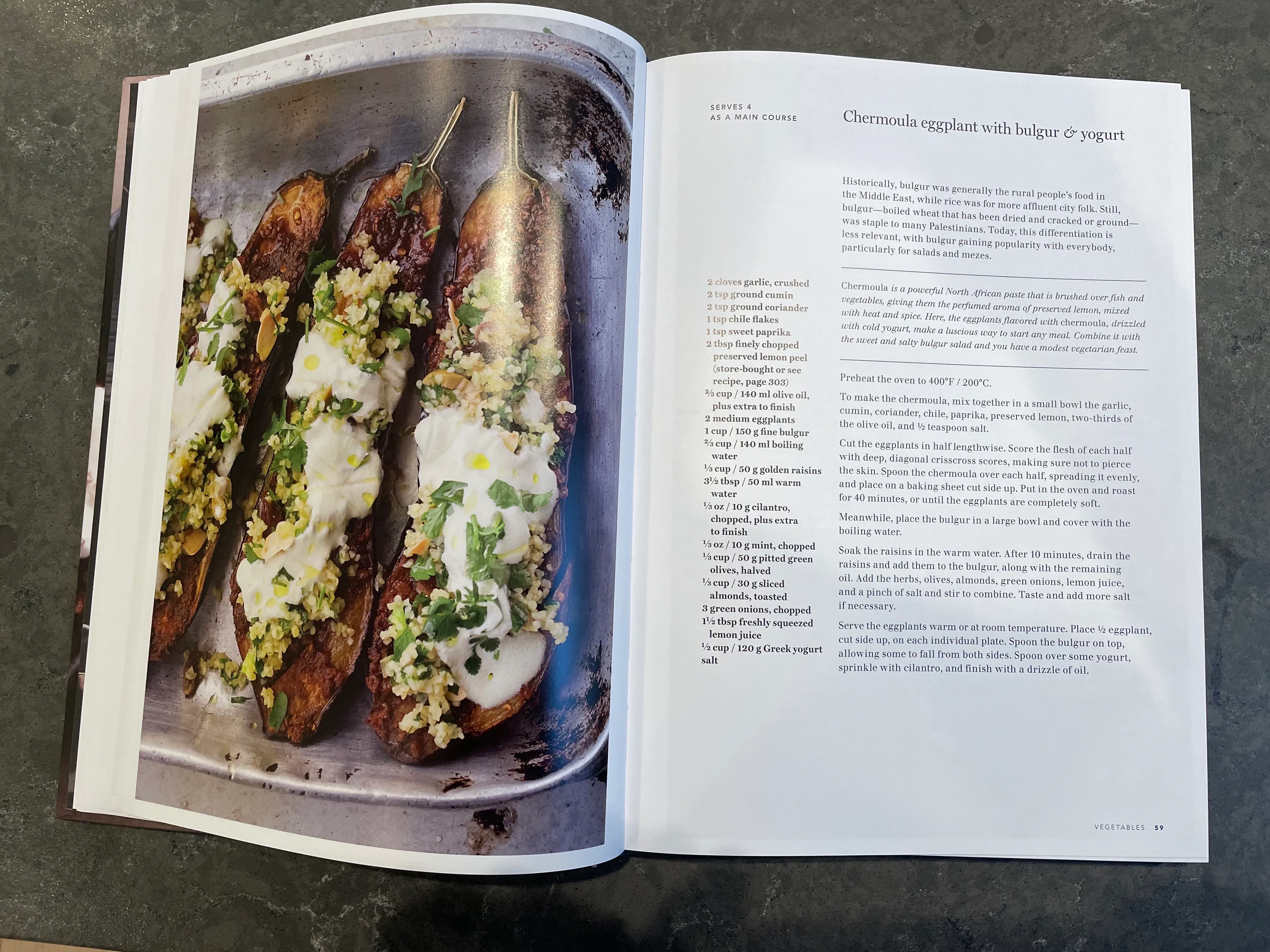 Chermoula is a powerful North African paste that is brushed over fish and vegetables, giving them the perfumed aroma of preserved lemon, mixed with heat and spice. Here, the eggplants flavored with chermoula, drizzled with cold yogurt, make a luscious way to start any meal. Combine it with the sweet and salty bulgur salad and you have a modest vegetarian feast.