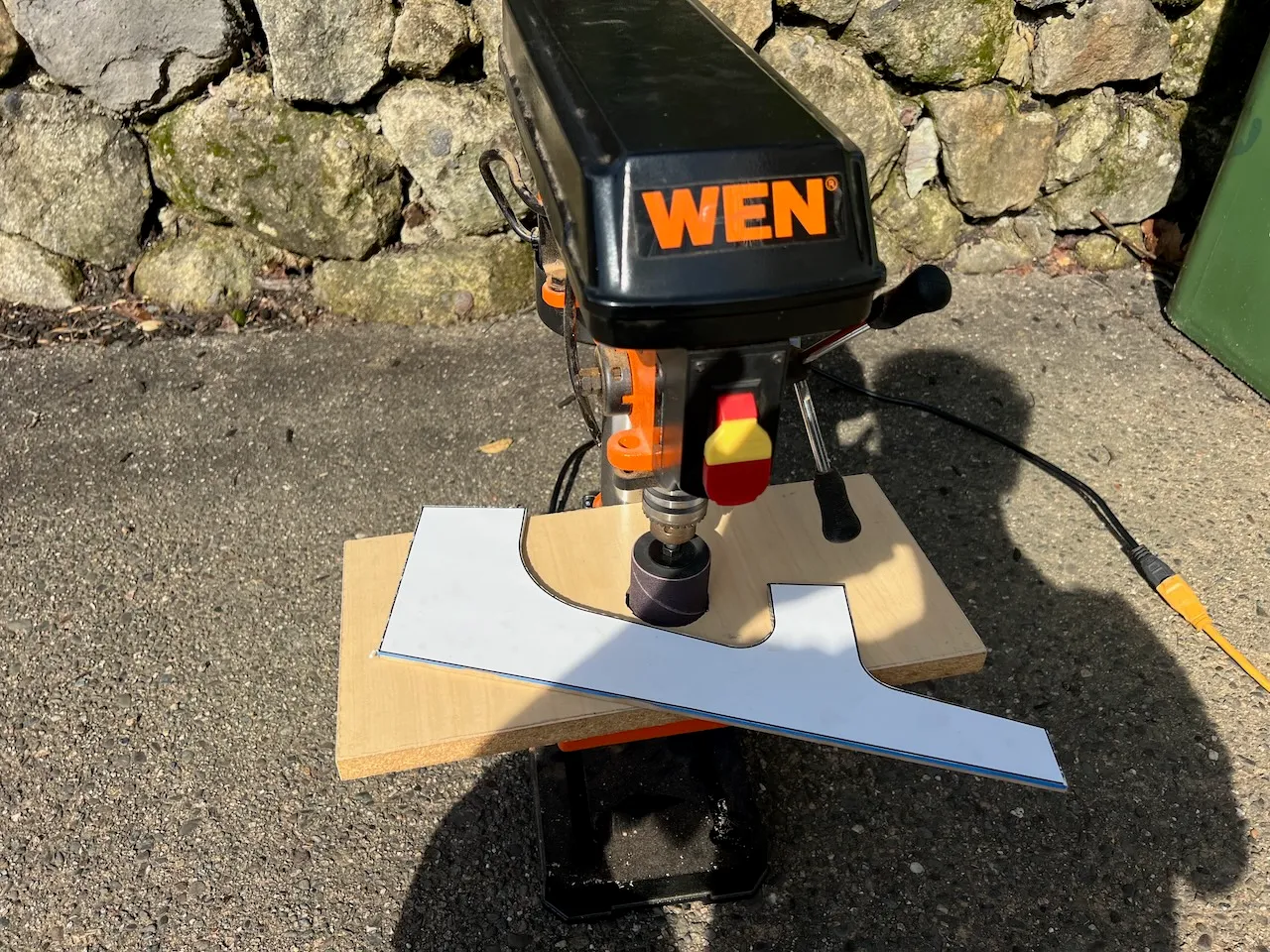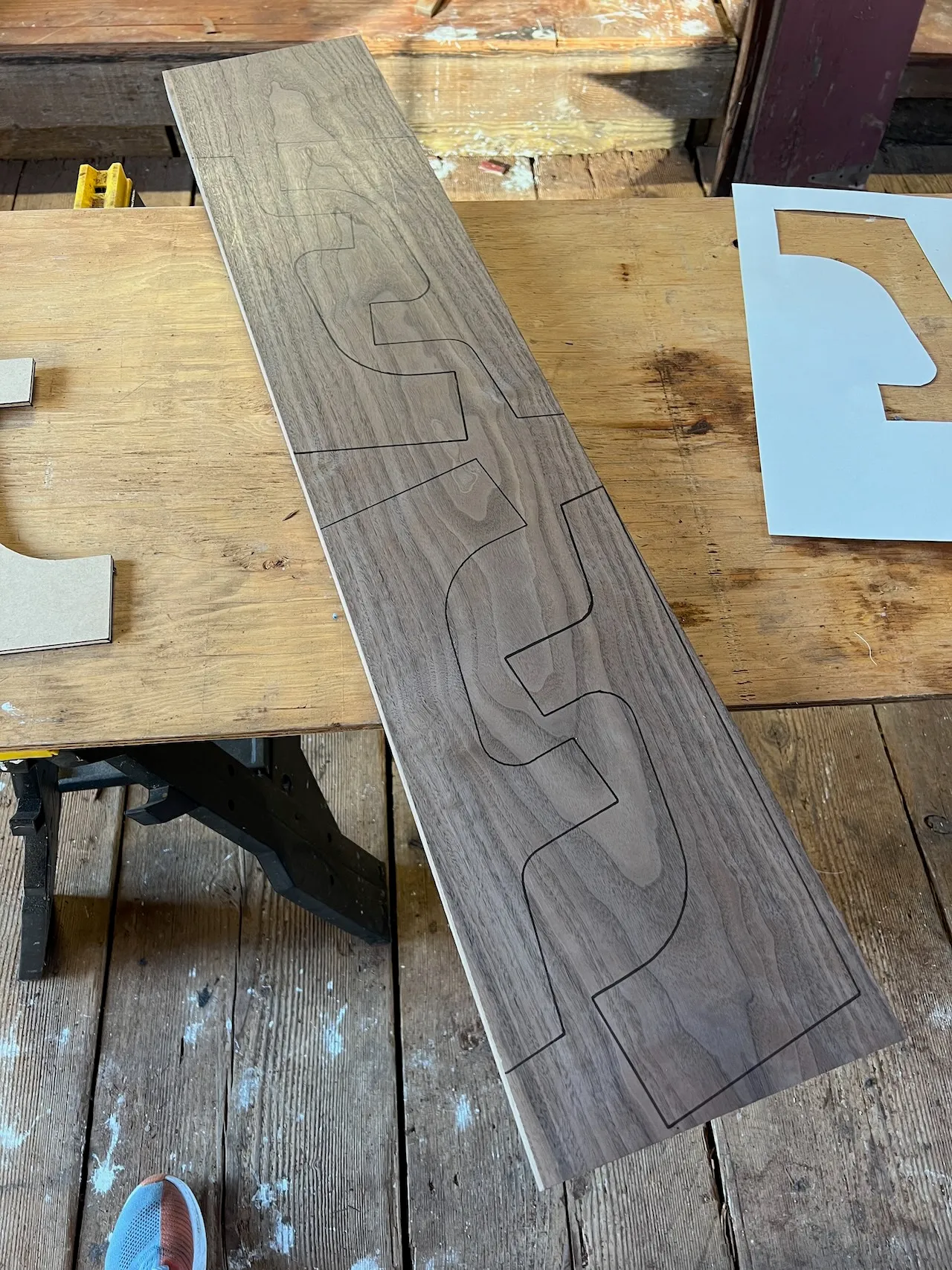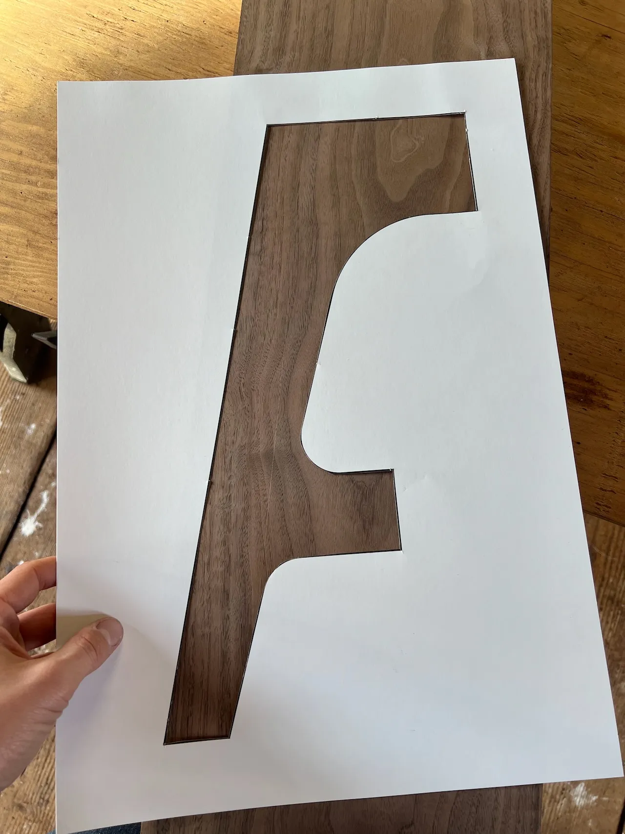 For the legs, I decided to make a paper template, which I stuck to a piece of ¼" MDF, which I cut with a band saw and sanded down with a spindle sander (or, rather, a drum attached to a drill press). From there, I could trace the template onto the raw walnut and roughly cut the legs on the band saw. Then, I double-sticky taped the template to the leg and used a flush trim router bit to get to final shape.