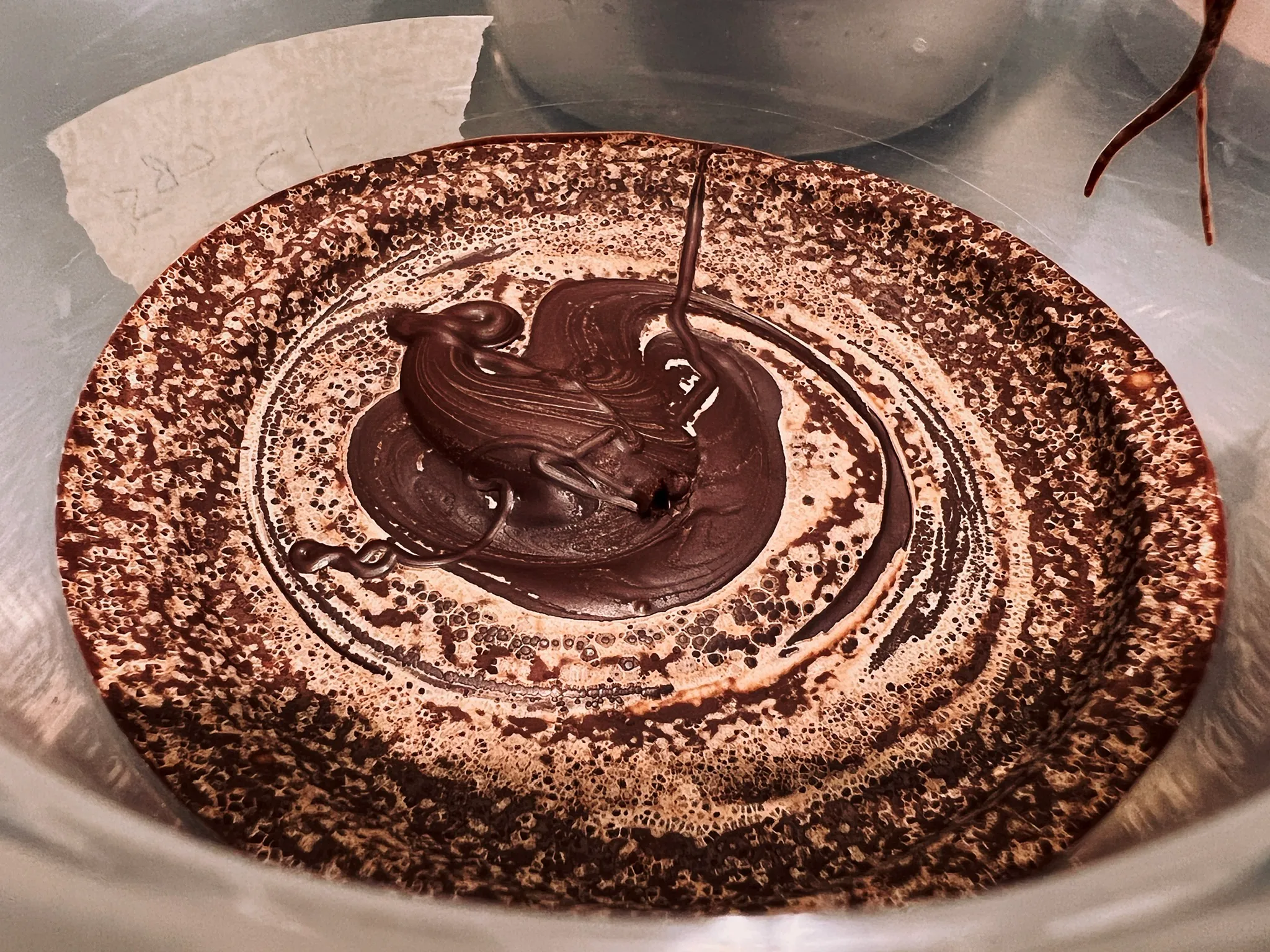 I've been fascinated by the patterns chocolate makes when fats and sugars separate from the cocoa solids (when it "blooms"). These patterns are beautiful and can look like the surface of another planet. I started experimenting to create different kinds of bloom. My goal is to create a large-format print of Chocolate bloom art, but lately I've been thinking: why not mount a sheet of bloomed chocolate directly on the wall?