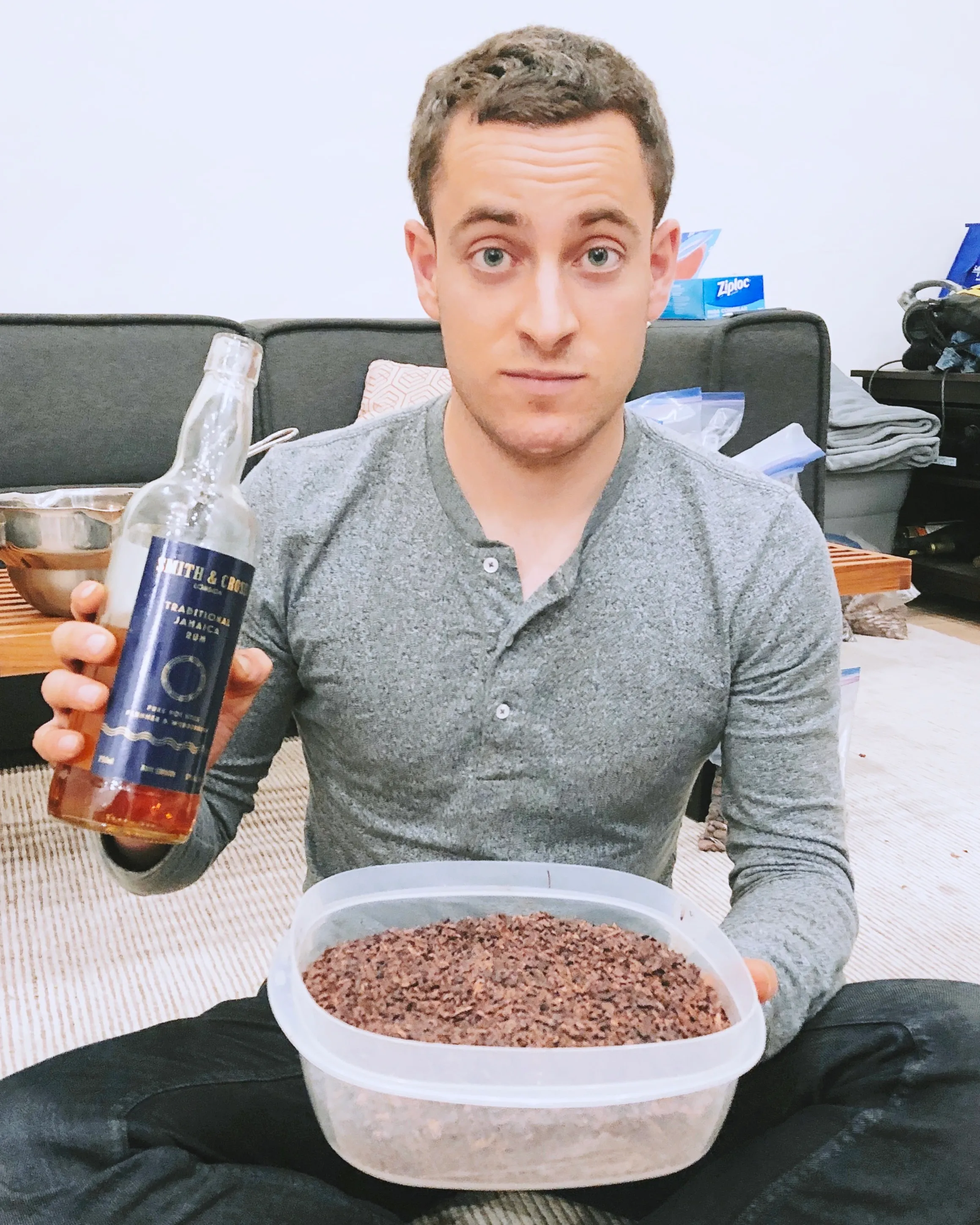As for the specifics: you want to fully saturate the nibs; we've found that 500ml of liquid for every kilogram of cocoa is plenty. An airtight and well-sealed container like a large Tupperware or Ziplock bag makes it easy to shake the nibs every so often to make sure they absorb all the liquid. We usually soak the nibs for 24-48 hours, although I bet you can get away with more or less time. Drying out the nibs can be accomplished with a dehydrator or oven at 140-150F for about 12 hours.