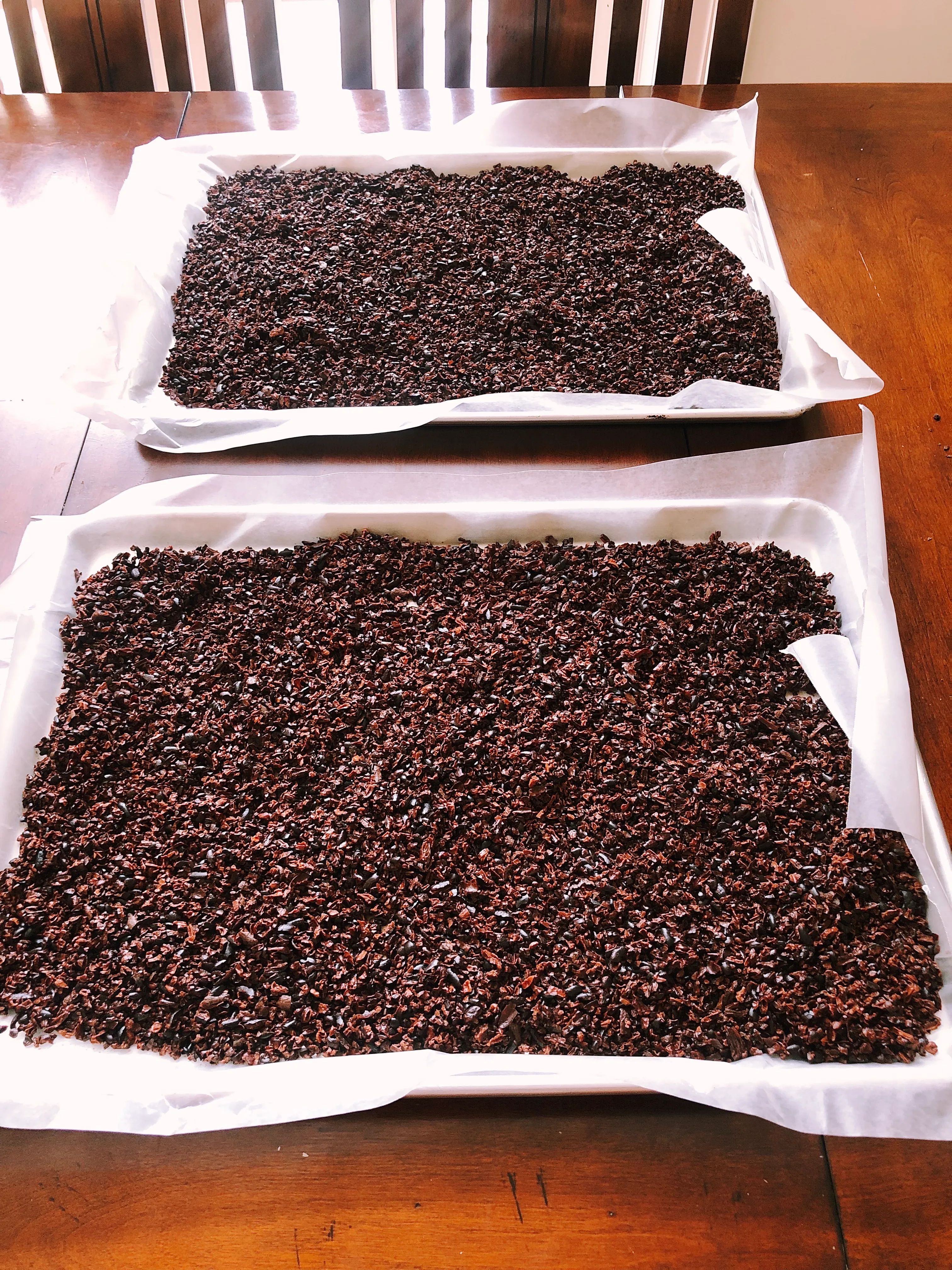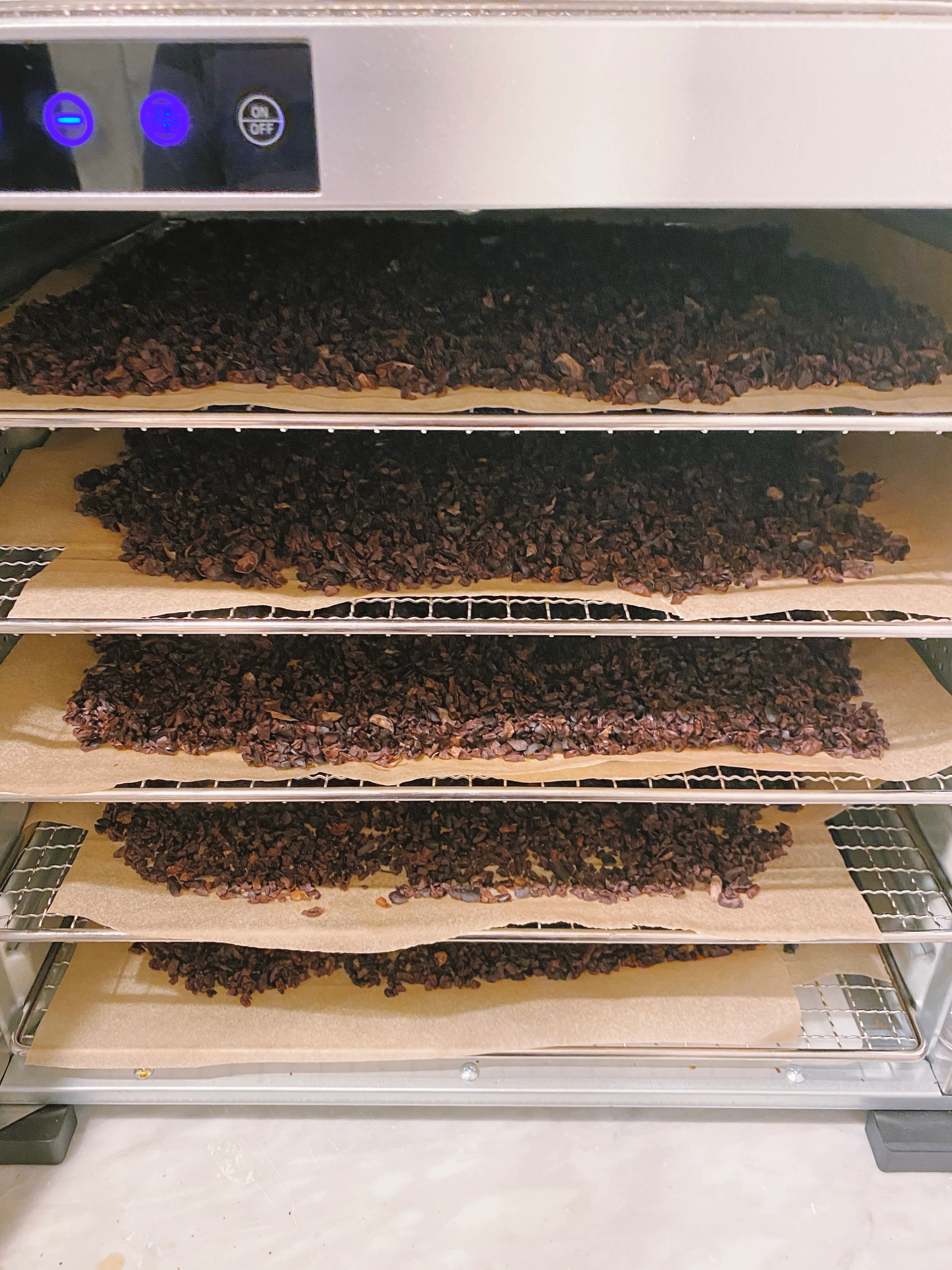 Nibs drying out in the dehydrator, after being soaked for 24 hours