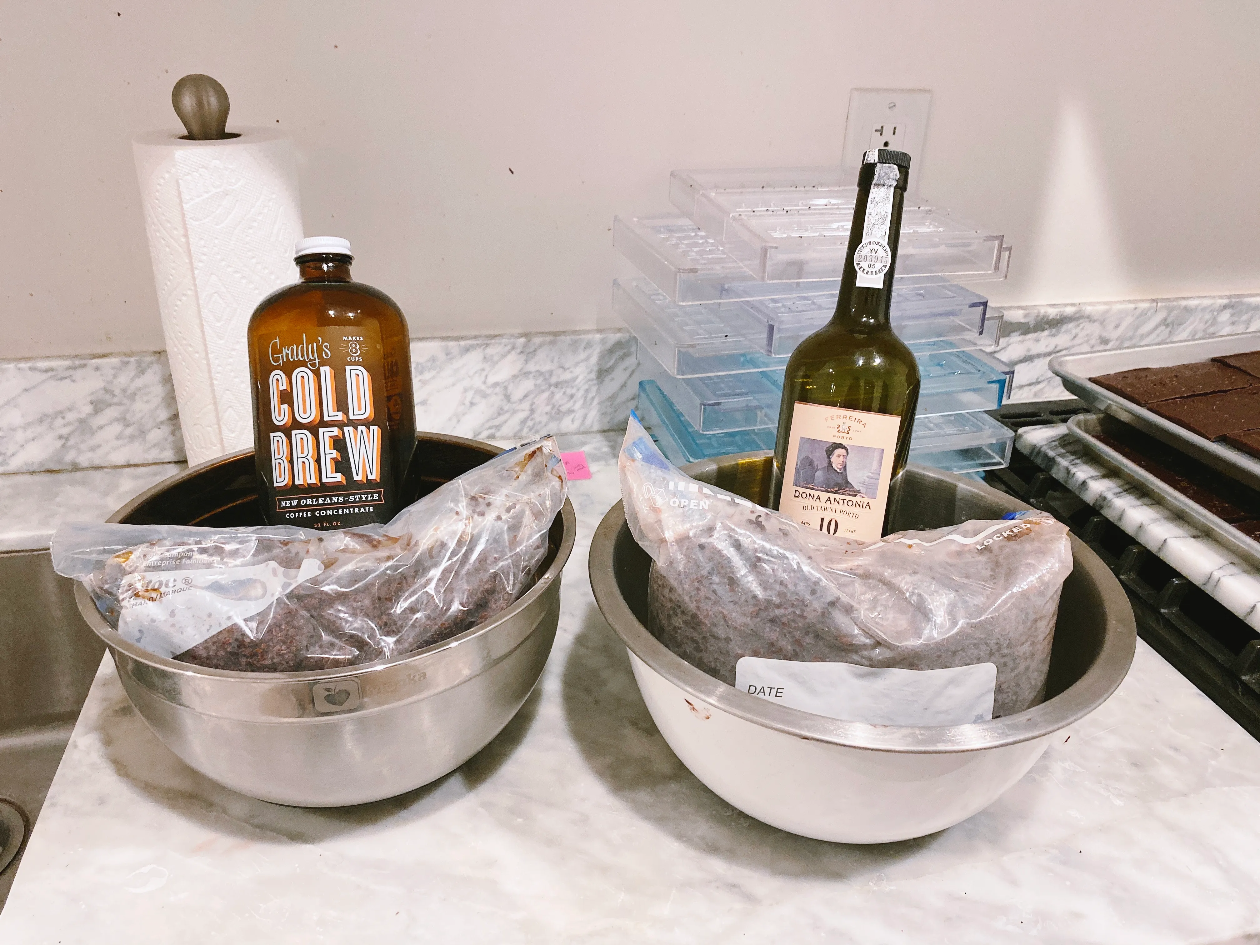 The most common way to make a coffee or tea flavored chocolate bar is to add the coffee grounds or tea leaves directly to the refining process, and this works well. One of my favorite chocolate bars of all time is made this way. But I came across a delicious New Orleans style cold brew and wondered if I could use it to make chocolate. Steeping the nibs in the concentrated cold brew resulted in a cleaner and more subtle flavor than using coffee grounds. After making an Earl Gray chocolate with raw tea leaves, I wondered if I could control the bitterness of the tannins by soaking nibs in a concentrated tea instead. This did result in a noticeably less bitter chocolate, although the flavor was milder and the moderate improvement in taste may not have warranted the extra effort.