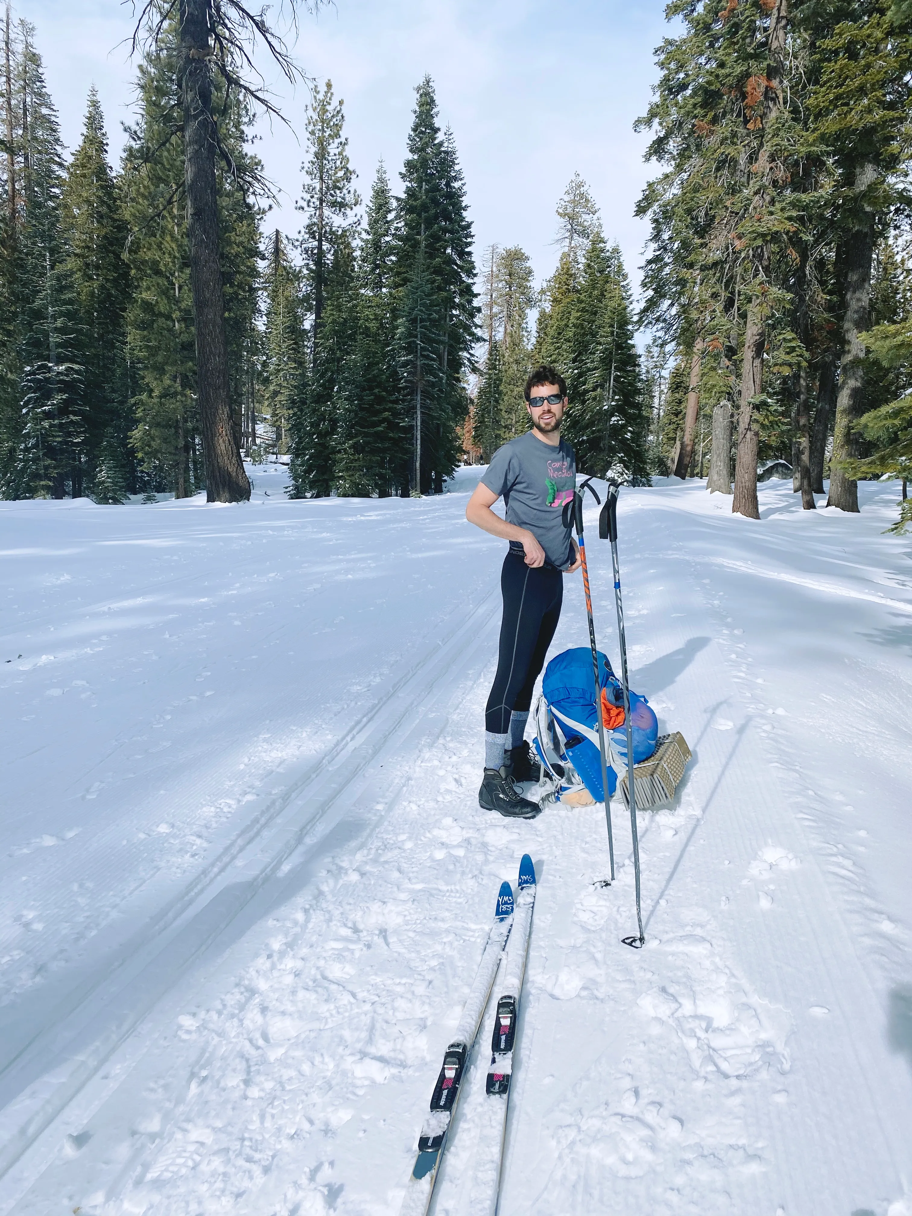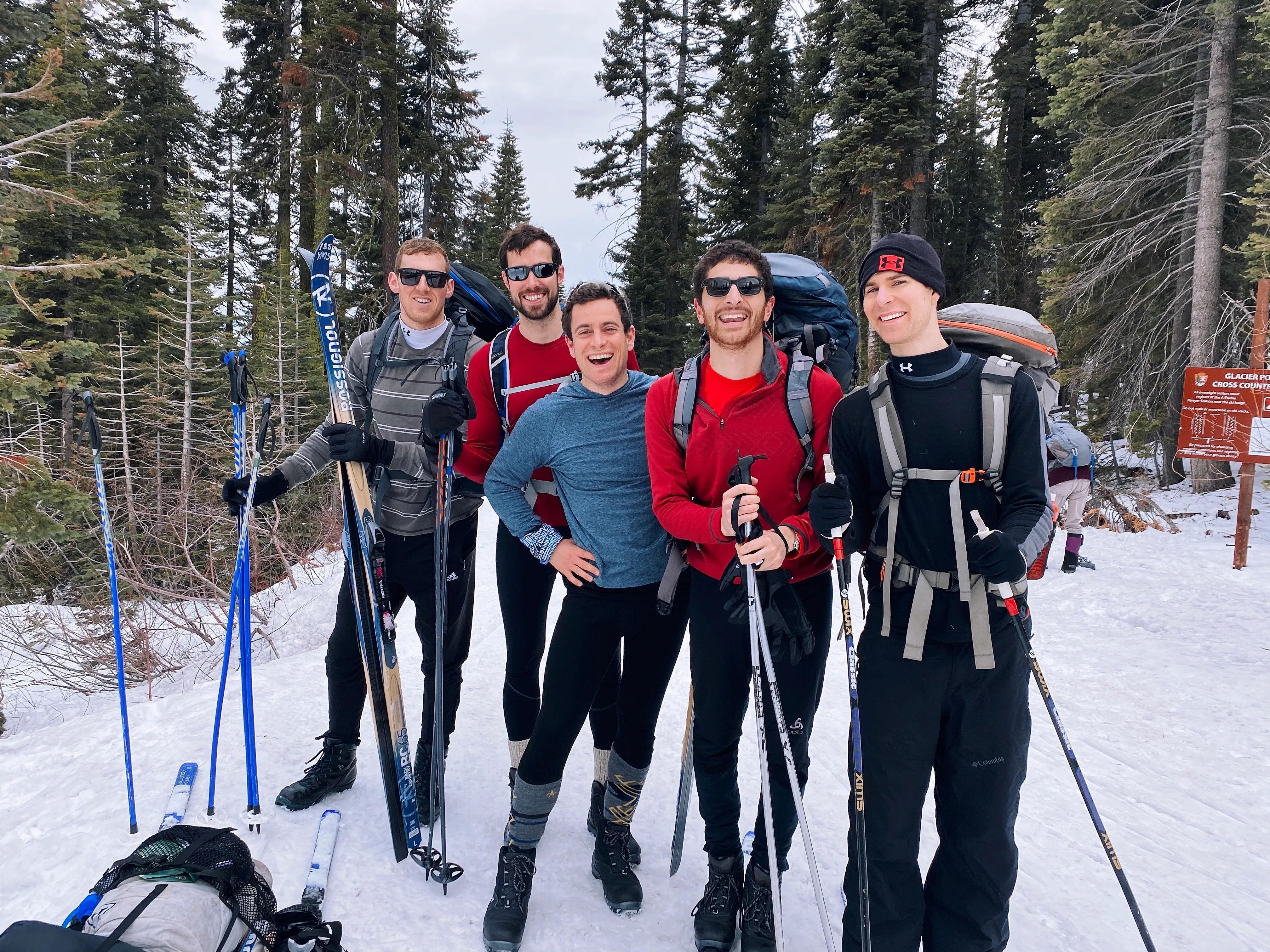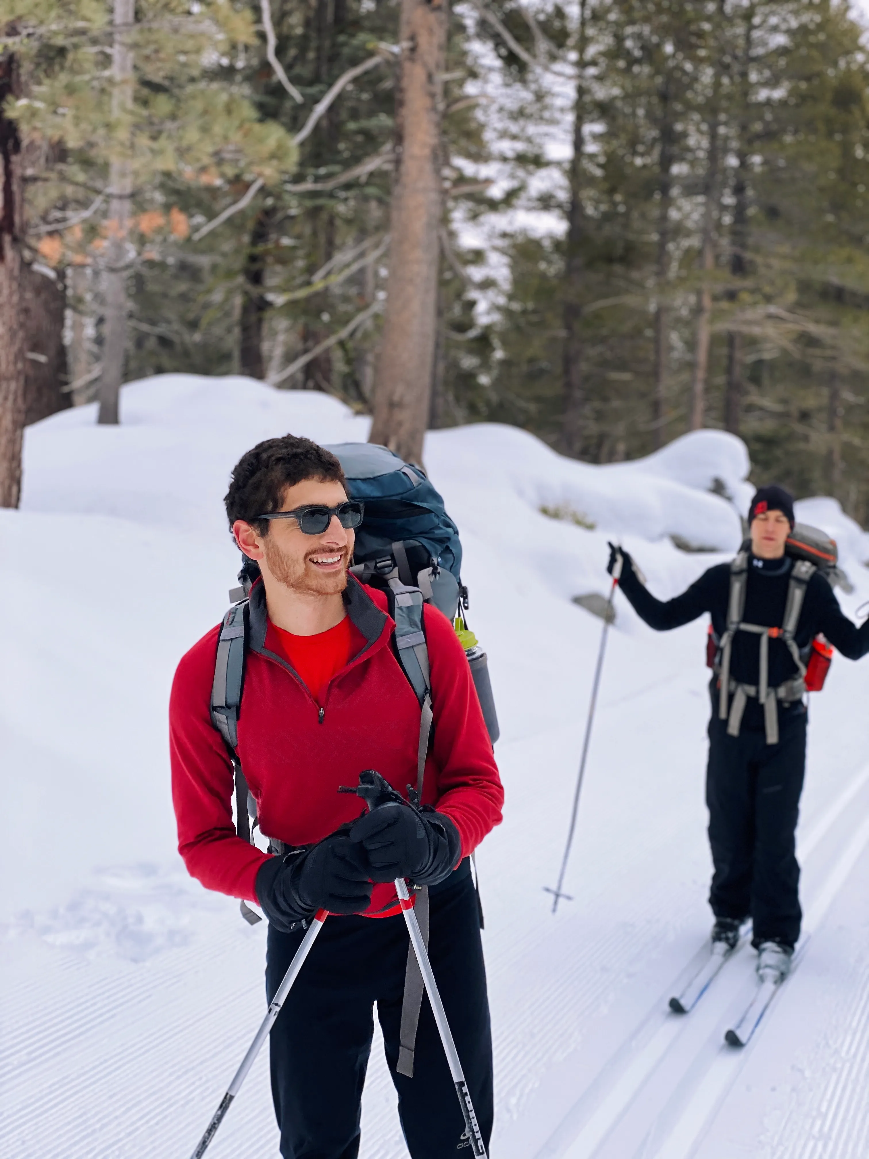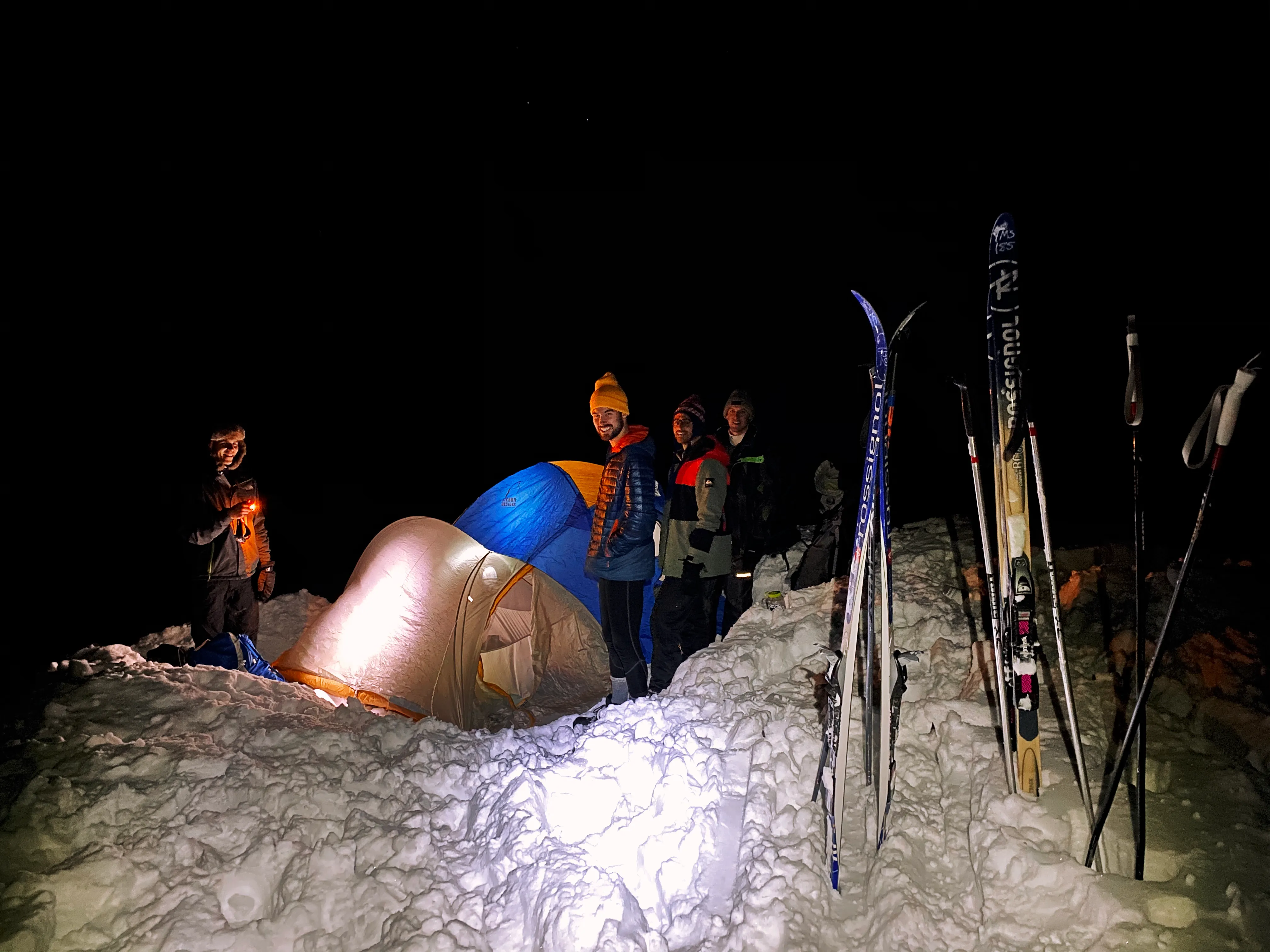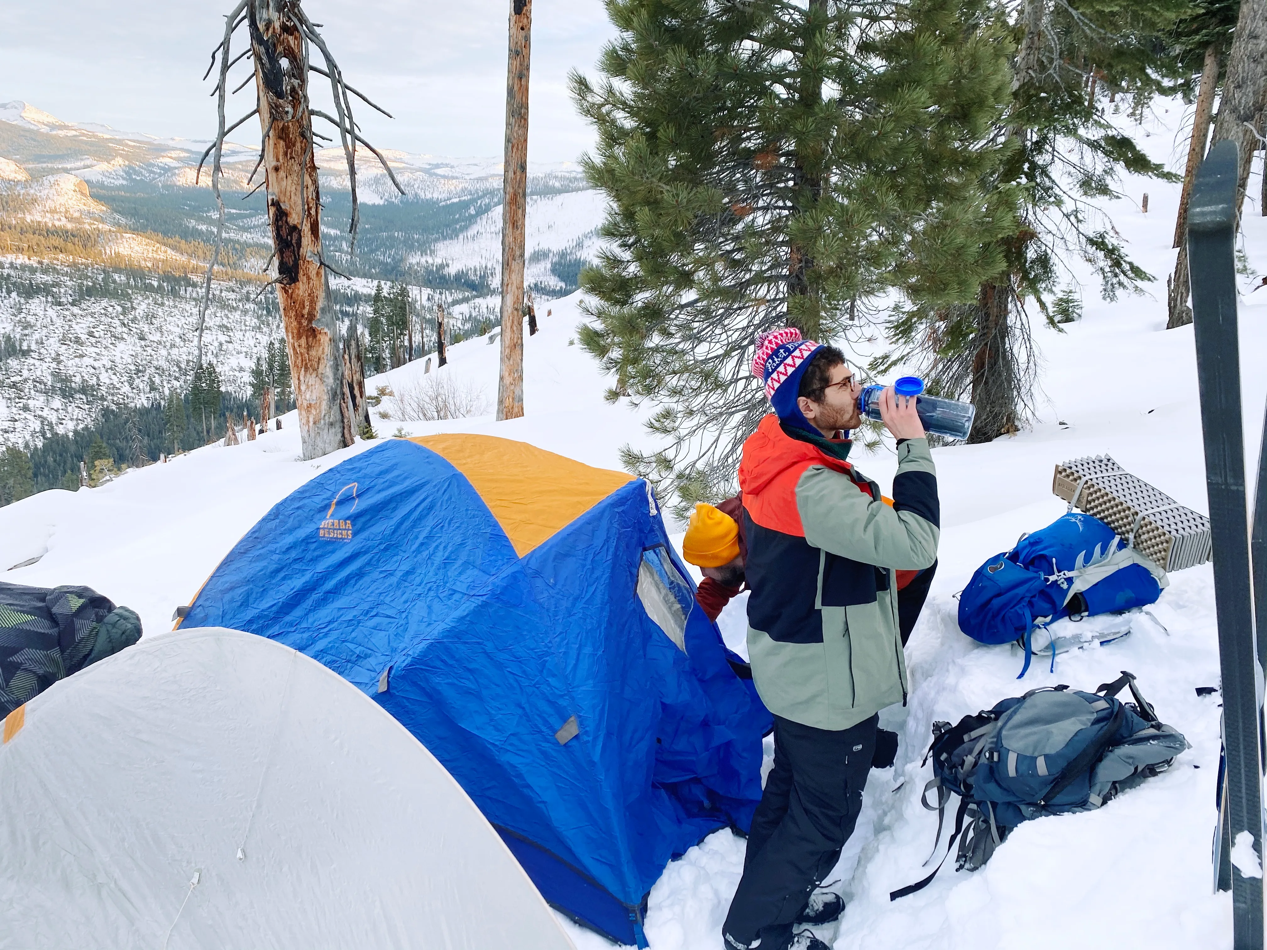 There is a ski hut that serves hot meals, but we elected to snow camp. The weather was temperate (about 30F at night) and we stayed decently insulated in our tents. Make sure to bring food, a bear canister, and plenty of fuel to melt snow for drinking water. It would also be wise to bring a rubber strap and some duck tape in case of equipment malfunction, as we found out the hard way!