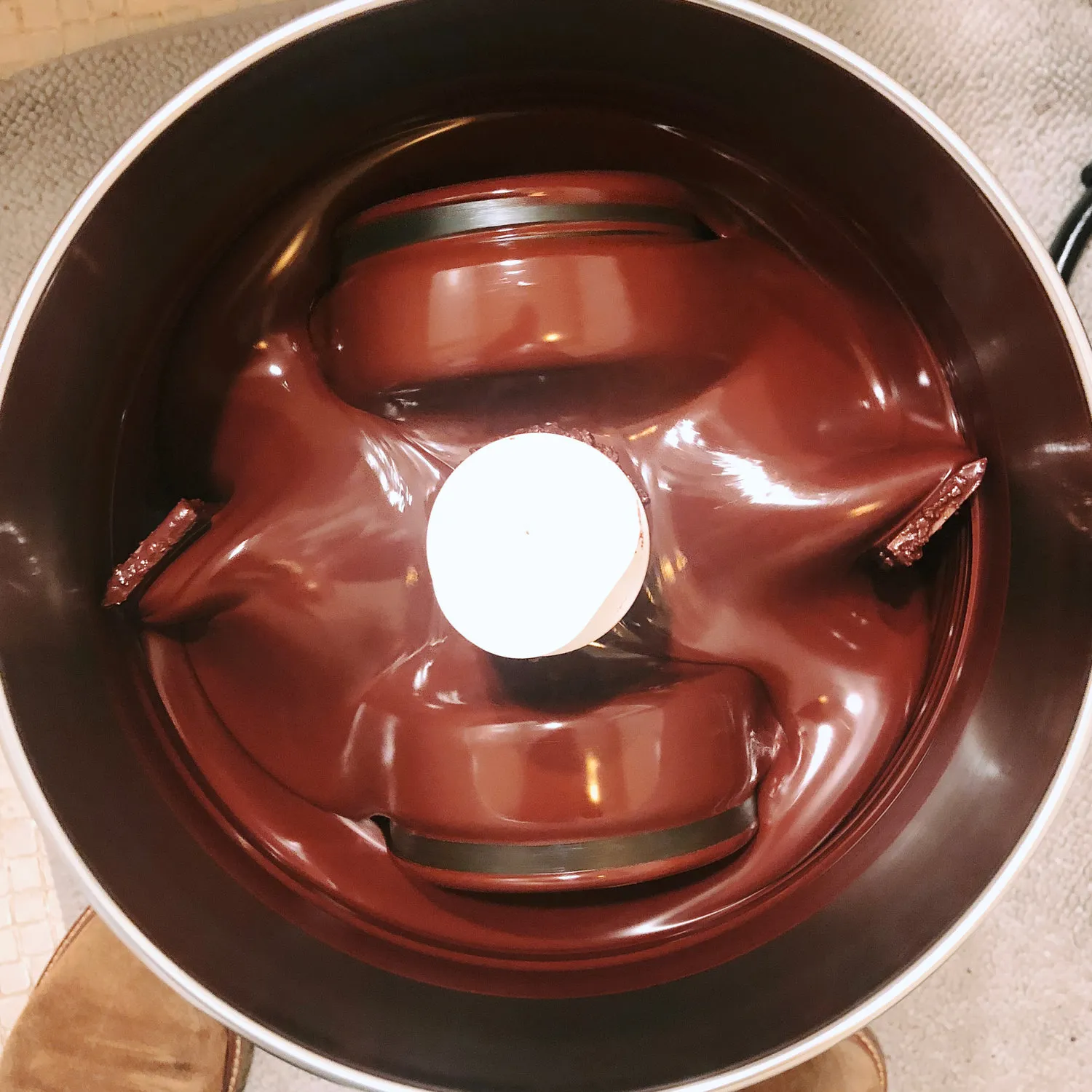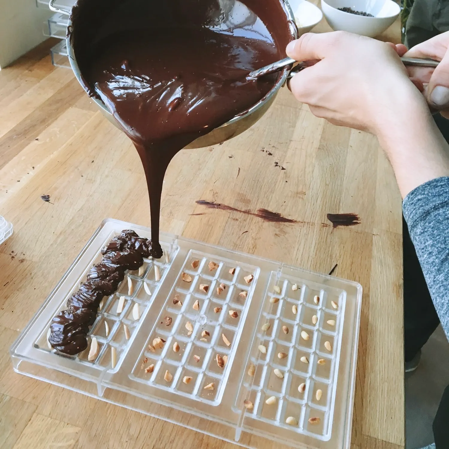 Once we have our roasted nibs, we grind them into a liquid paste called cocoa liquor. We start by putting nibs in a stone grinder (melanger). Then, we add our desired amount of sugar (e.g. 700 grams of nibs and 300 grams of sugar gives us 70% chocolate), as well as other dry inclusions such as spices. We let the melanger spin for anywhere from 12-48 hours (usually in a spare bathroom… it’s loud, but behind a door it’s a pretty good white noise machine!). Heat produced from the friction of the stone wheels keeps the chocolate molten.