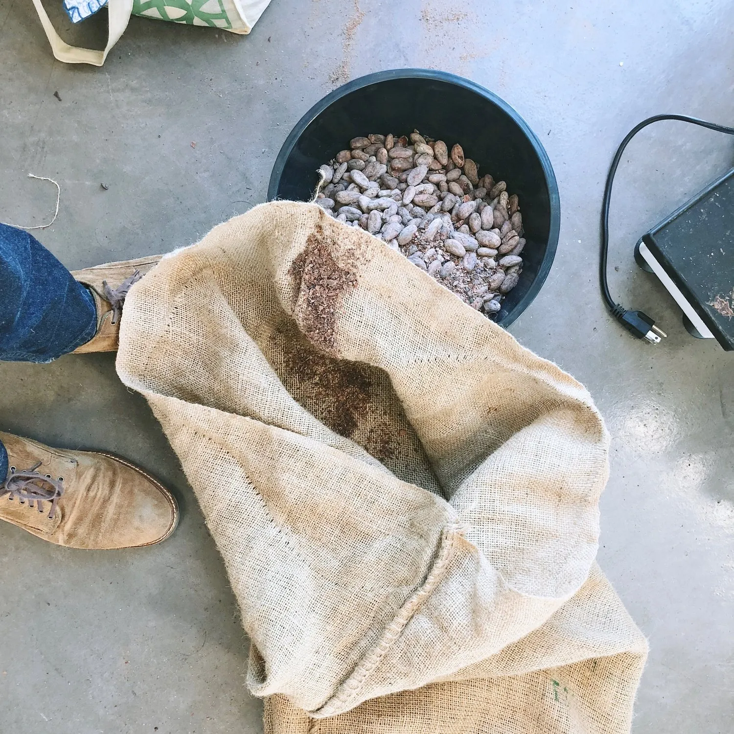 Not all beans in a batch have great flavor; sorting is how we attempt to remove poor-tasting or tasteless beans from the lot. We remove cracked beans (since the nib inside has been exposed to air), super flat beans (tasteless), very light-colored beans (under-fermented), and extremely dark-colored beans (over-fermented) — about 5-10% in total. There’s a debate within the chocolate community about the importance of sorting; those who spend time doing it swear that their time is worthwhile and those who skip the step claim there is no tradeoff.
