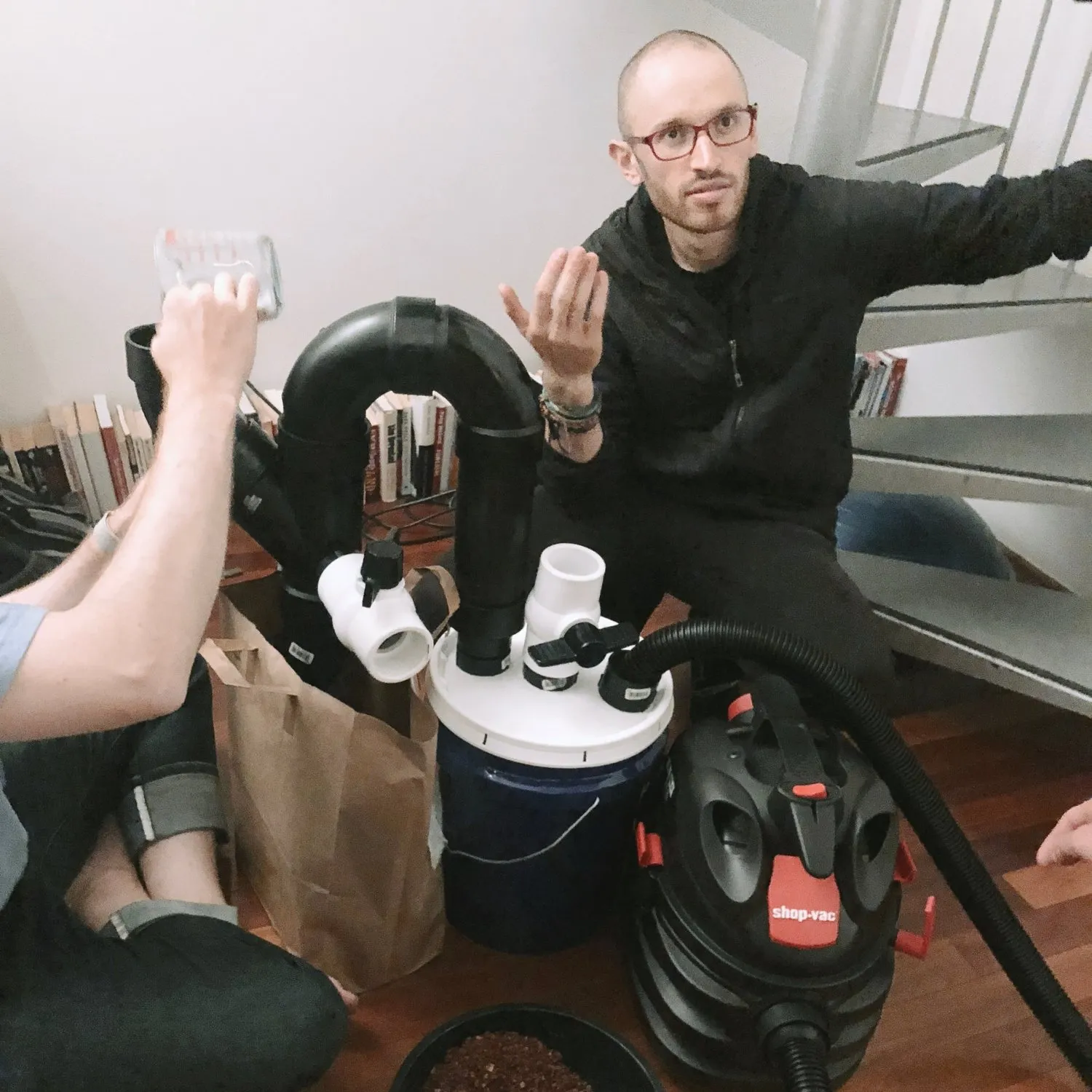 After the beans are roasted, we crack them. We use a Champion Juicer without the mesh screen, but you can also use a rolling pin or crack them in any other way you see fit. We then move the pieces through a winnower which separates the outer shell (husk) from the roasted cacao bean fragments inside (nibs). Our first winnowing process involved shaking the cracked beans in a large bowl while someone used a hair dryer to blow away the husks (usually at night on the roof, lit by a spare bike light), but we’ve since built a homemade contraption consisting of a shop-vac, PVC pipes, and a bucket: the heavier nibs fall while the lighter husks are sucked up by the vacuum.