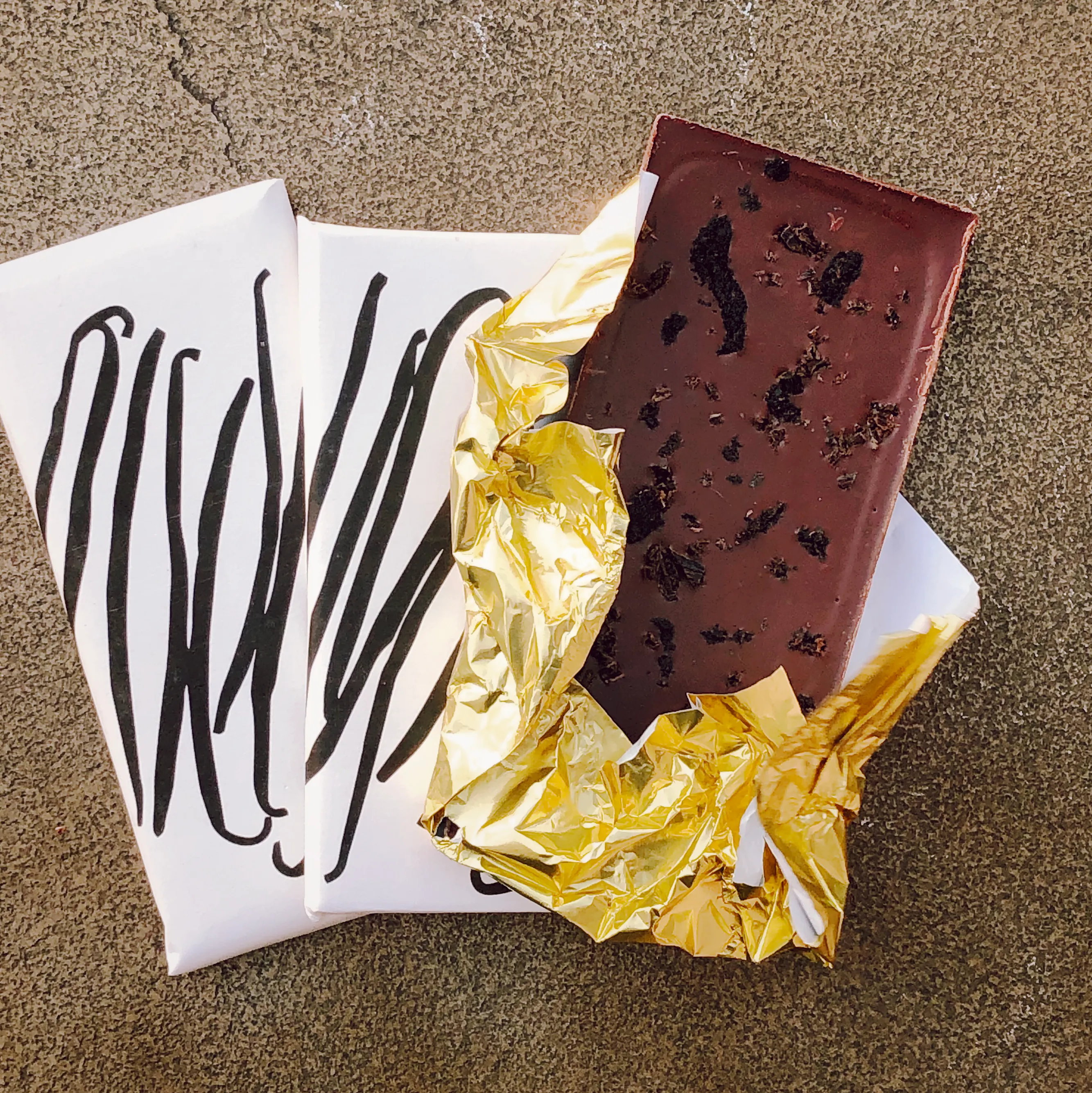 Once our bars are fully set, we carefully twist them out of their molds and wrap them in a thin layer of gold foil. We usually just label the bars in this form, but sometimes we print a paper outer-wrap for special occasions.
