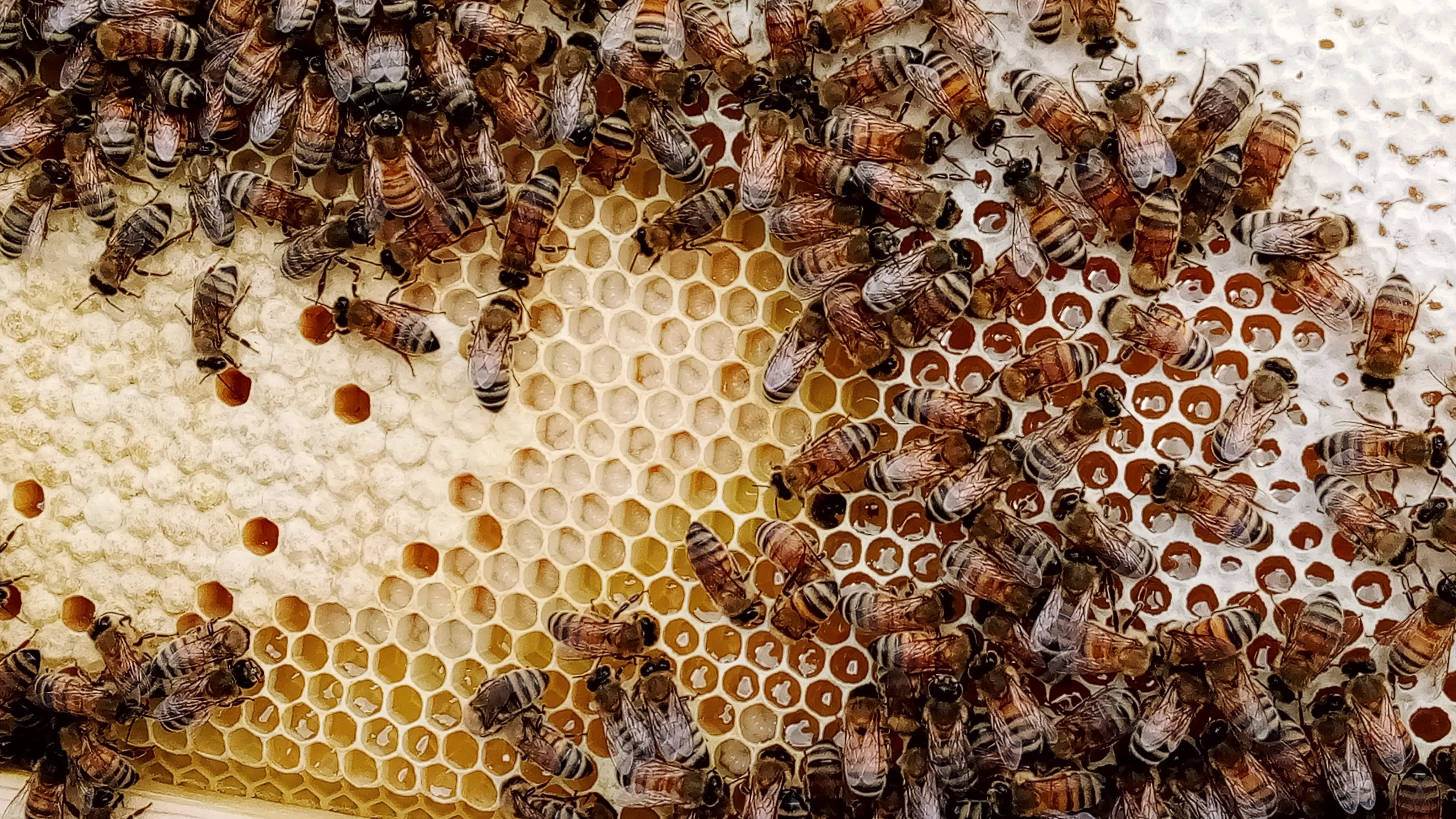 Honey cells in various states of completion