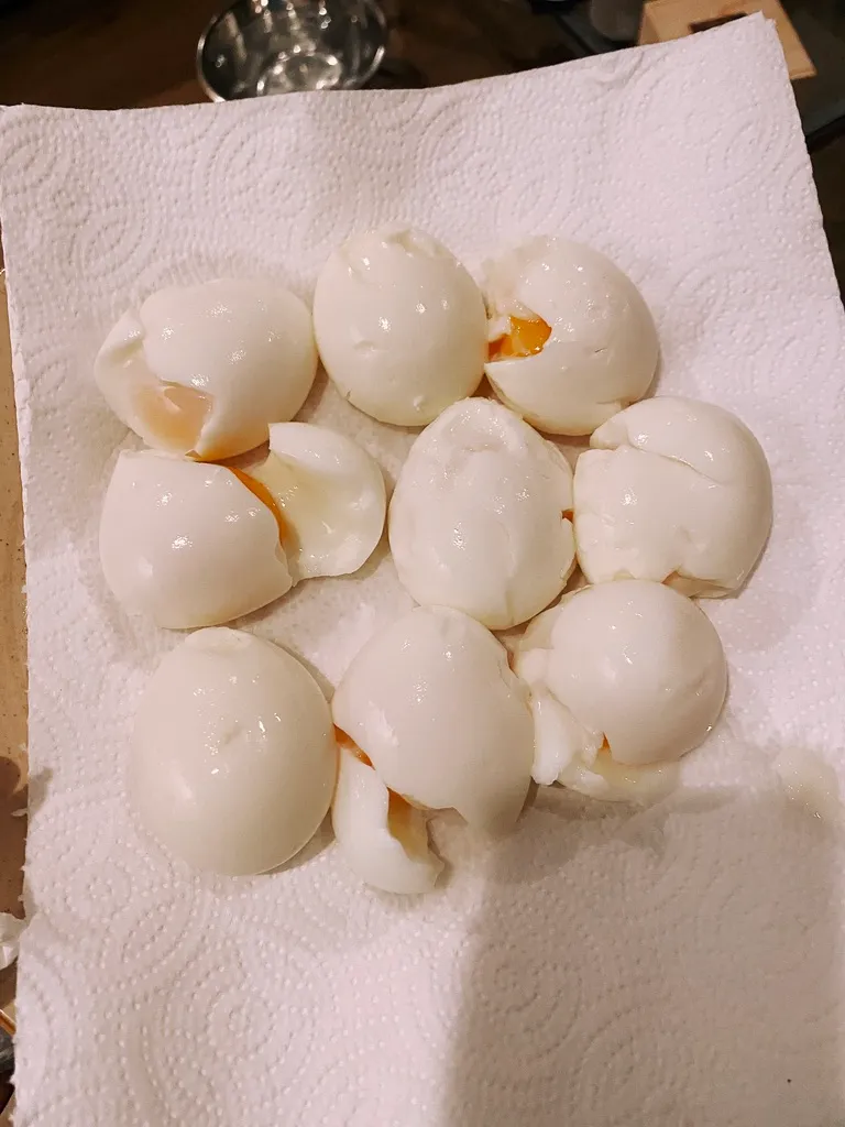 Really do prioritize getting old, cheap eggs (yes, the more tortured ones). They are FAR easier to peel. Otherwise you'll end up with this (which can still work):